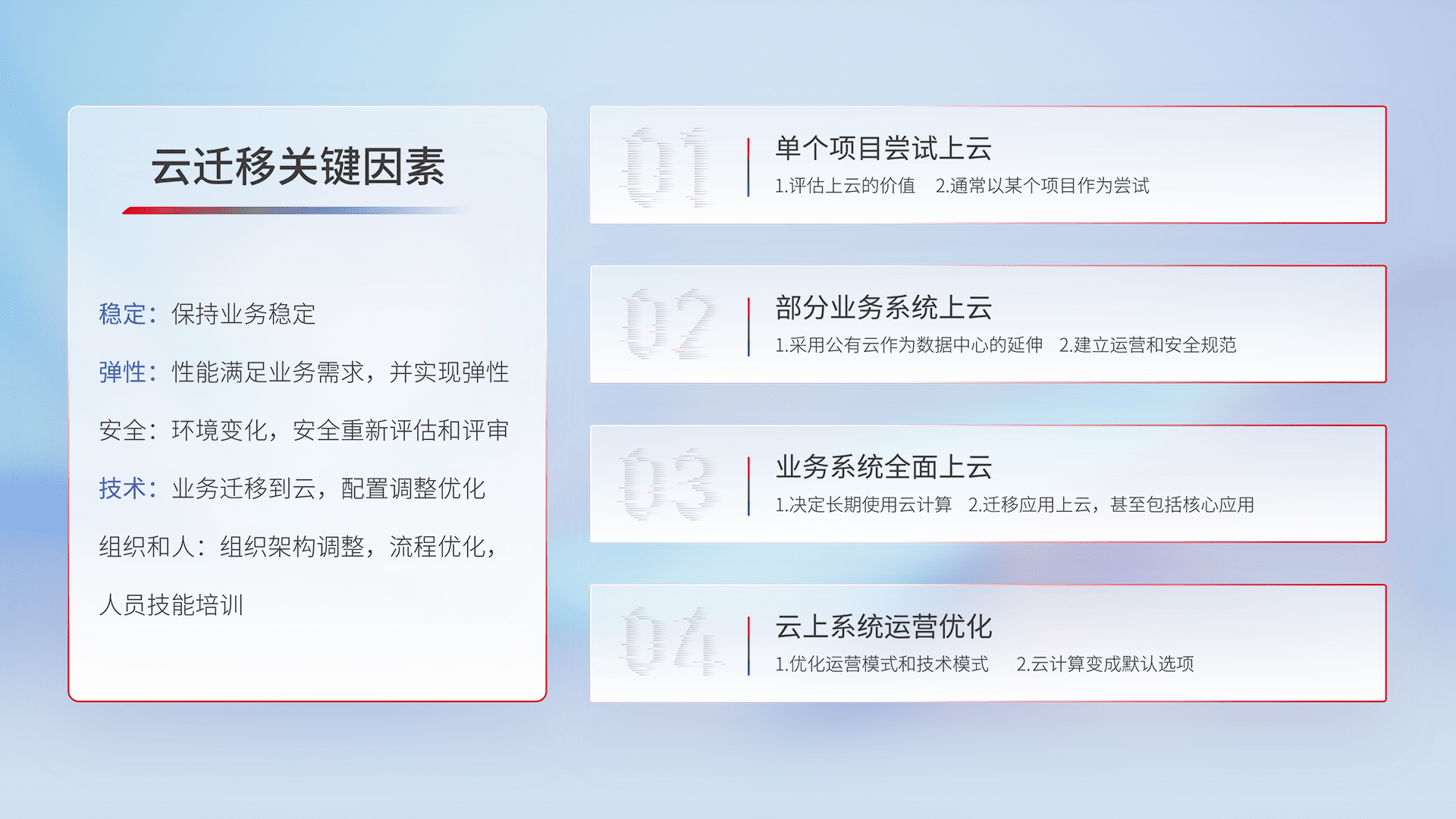 结合实际业务,,,从规划设计、、、云平台选型、、、云原生改造、、、数据迁移、、集成交付,,迁移全过程为客户识别最佳上云路径,,,,做好风险识别管理,,,,设计网络架构、、、身份权限、、安全审计合规、、操作审计、、日志审计、、监控告警策略、、、、多站点容灾设计等,,对云上基础设施进行整体规划,,提升IT治理水平,,以满足弹性、、、高可用、、、、高性能的需求。。。