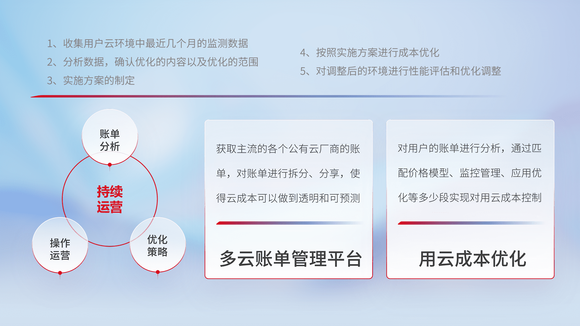 通过多云纳管,,,以统一的资源数据模型把客户的云资源进行抽象和封装,,进而实现对多云资源的统一操作,,,保障云资源管理的可靠性、、、稳定性与可用性。。。。量身定制化运维内容,,,配置、、、开发运维、、、补丁管理、、备份、、、监控、、、认证和访问管理、、、审计和日常巡检等,,,,保障在用云过程中的可靠度,,,稳定度以及高可用率。。。。