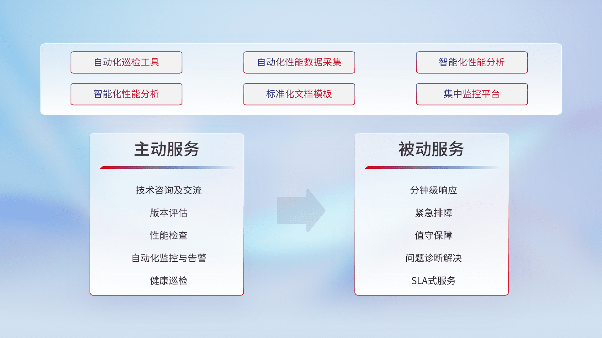智能化工具和标准化文档,,,,保障服务质量,,提供主动服务(包含技术咨询、、版本评估、、、性能检查、、、、自动化监控与告警、、健康巡检)和被动服务包含(分钟级响应、、紧急排障、、值守保障、、、、问题诊断解决、、、SLA服务)。。。